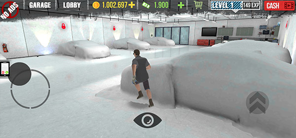 2、购买之后我们会进入到车库,滑动左下角的摇杆到一辆汽车的模型身旁;