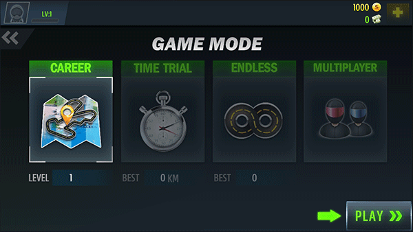 2、游戏内拥有关卡挑战、计时赛、无尽模式、多人赛四种模式玩法,选择你想要游玩的模式;