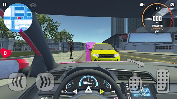 2、操作角色完成上车动作,坐进车内你会看到图中所示的界面,左侧为方向按键(你也可以通过左上角的“播放”按钮打开设置,选择适合你的控制类型),右侧为油门和刹车踏板,包括手刹也是,中间部分则是危险报警闪光灯,转向灯、雾灯和喇叭,熟悉掌握这些技巧之后,紧接着查看地图上的乘员位置,并将其送往目的地吧!