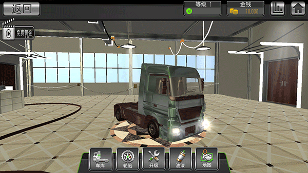 4、点击左上角的“暂停”标志可以进到车库界面,玩家可以对卡车的外观、轮胎、油漆等进行升级设置。