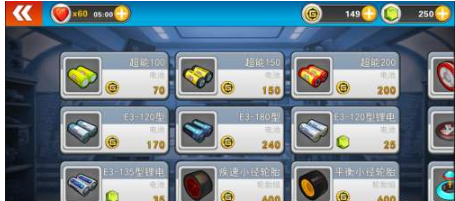 左侧代表现在当前车辆电池拥有的电量,右侧代表最大电量。点击“+”号进行充电,1点电量=1G,非锂电池充电会掉最大电量10点。(当开始游戏时候电量变为“0”的时候,恭喜您,屏幕会跳出:“未完成,请注意电量与耐久!再接再厉!”原因嘛大家懂得)