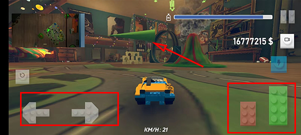 3、开始游戏,左边左右箭头是控制方向的,右边的红色踏板是倒退油门,绿色踏板是前进油门,你需要跟着中上方的绿色箭头去完成任务。