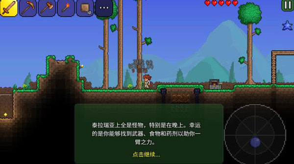 5、创造完世界后,马上就会进入游戏地图开始冒险。在一开始只有一些基本的工具,以及眼前的一位新手指导员,跟他交谈可以学到很多新手该知道的知识,其中最重要的一点就是在夜晚前赶快盖好一间房子。(否则就要风餐露宿了...)