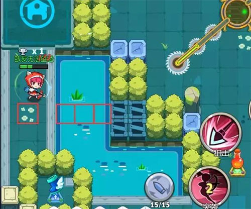 3、2技能原本会在射出的过程中被墙体裆下,但如果从某些自上而下的角度发射,则可越过墙体射出,利用这个特性可以很好的一边利用墙体保护自己,一边进行输出。(例如2技能配图中的情况)