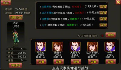 供玩家进行PVP互动的系统,玩家每天都可以通过竞技场排名领取一次奖励。前十名玩家还会被列入英雄榜,接受屌丝们的膜拜…当你达到一定的连胜次数或者名次时,系统还会会发布令美女尖叫恐龙色变的“全服公告”哦~