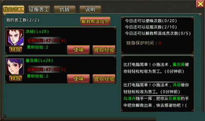 玩家通过“征服苦工”列表“征服”与自己相差不超过五级的玩家,使之成为自己的“苦工”。“主人”通过“使唤苦工”来获得收益,“苦工”可以反抗主人,也可以通过“讨好主人”获得收益。倘若自身实力不济还可以请求同帮成员来解救你。纳尼,没有帮派?帮派可是好东西啊,多种多样的活动,靓丽养眼的帅哥美女,多得让人发指的福利…现在入会只要999哦,亲~