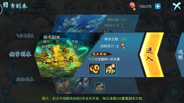 铜币副本 开放等级:20级 周二、四、六、日开放