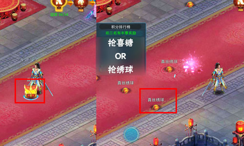 听到新郎新娘的誓词,看到新郎新娘的拜堂仪式,泪水都会莫名感性起来,再过几级会不会开始恨嫁。不用方!新人祝福会通过抛绣球的形式传递下去!婚宴全场会刷新10波绣球,绣球是道具、积分或者陷阱。陷阱的存在增加了抢绣球的热情,高涨的参与热情,趣味的互动,宾客们玩得不亦乐乎,在这寒冷的冬日,赶紧一场绣球大战,传递幸福,抢夺奖励咯。