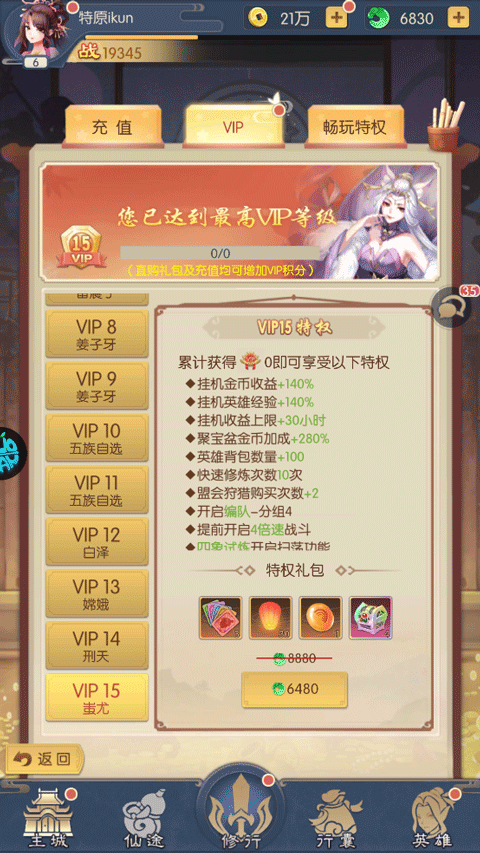 3、游戏上线即送vip15,可以免费领取一次vip奖励,不要忘了后续还可以用仙玉购买vip礼包。