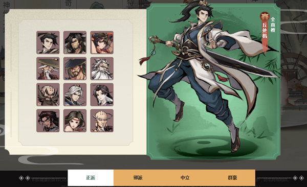 角色方面的话,建议各位先去玩玩正派流派。游戏中的正派很强,在前期阶段有有着压倒性的优势且成长较快,人缘较好,容易成型。不过不要玩少林,目前为止少林的数据和实力不是很强,即便前期运气不错,抽到了好的少林卡,也建议不要培养到了中后期作用不大。