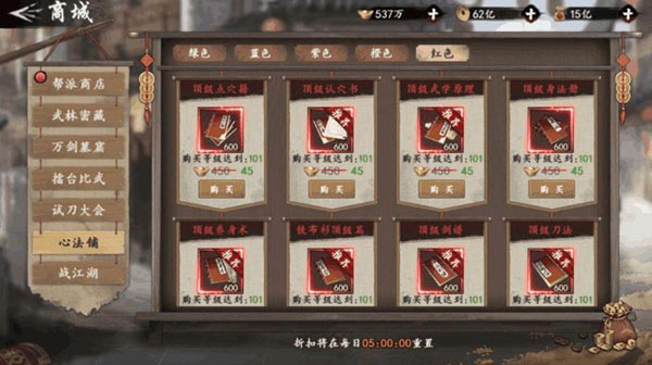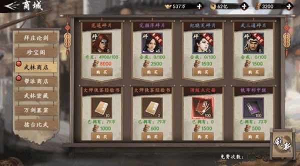 游戏内的氪金程度是众多玩家关注的问题,经过深度的试玩后给大家带来目前游戏这方面的介绍。游戏商城种类很多,每一种商店需要的货币都不相同,比如说武林商店可使用功勋来购买侠客碎片,功勋值可以通过游戏帮战玩法获取。