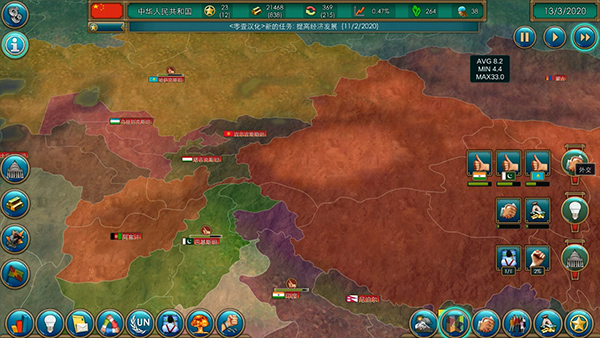 游戏中的上方为国家的主要信息,各种国际新闻、国际事件也会在这里实时刷新