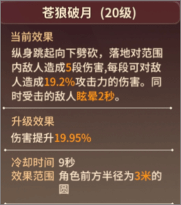 苍狼破月:范围型伤害,技能释放后可以对角色前方半径3米内敌人进行多段伤害攻击。同时收到攻击的敌人将会受到眩晕2秒的控制,配合“一阳贯日”的近身特点,迅速控制对手,并造成伤害。