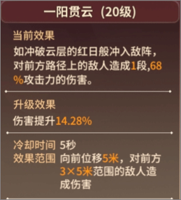 一阳贯云:作为刀客最先获得的技能,一阳贯云可以造成突进伤害,不论是在PVE还是PVP,都可以快速近身,对前方敌人造成伤害,第一时间吸引仇恨。