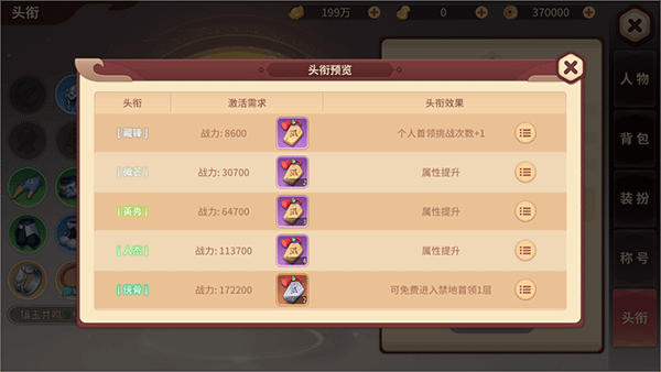 了解了如何获取头衔,接下来再来看看头衔的作用。头衔随着等级的提升,外显的文字与颜色皆不相同,放眼望去,头衔等级高的侠士自然是“厉害”的代名词!当然,头衔的提升,不仅能给侠士们带来给力的属性提升,同时还能获得一些额外的福利:比如个人首领挑战次数+1、可免费进入禁地首领1层等等。
