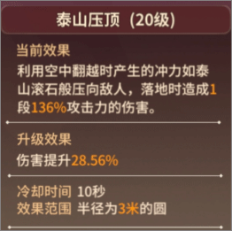 泰山压顶:最为刀客伤害最高的技能,泰山压顶的攻击区别于其他只能对前方敌人造成伤害的技能,泰山压顶为360度伤害