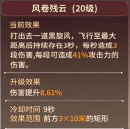 风卷残云:同为多段伤害技能,风卷残云的攻击范围更广,作为近身职业,在团战中可以起手对大范围敌人造成伤害,吸引仇恨,但是要注意该技能只能攻击角色前方的敌人。