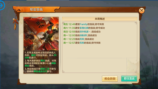 3、发起宣战只有指定人员可参与,防御战帮会成员均可参与。