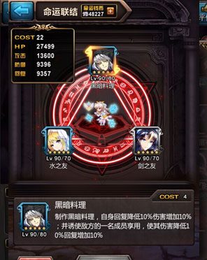 命运技,黑暗料理:自身回复降低10%,伤害增加10%。对方伤害降低10%,回复增加10%。作为己方的buff和随机地方的debuff,伤害增加和回复减少对于刺客来说是非常值得的替换。可莉珞的命运技能可以增加自己10%伤害,对于高攻刺客来说提升效果拔群。并且还能随机使一名对手降低10%伤害但回复增加10%。在PVE对阵单个BOSS时可以稳定降低BOSS的输出,提升队伍的生存能力。而在PVP战斗中若是诱使对面的DPS角色食用黑暗料理那就是极好的!