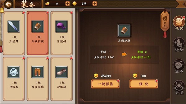 点击“强化”按钮,会强化装备1级;点击“一键强化”按钮,会直接将装备强化到可能的最高等级,直到金币不够或者装备强化到顶。