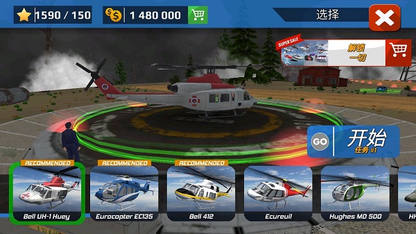 在开始任务之前,你可以挑选自己的直升机,在这里有数十种不同风格的直升机可供玩家选择,选择完成后,点击“GO 开始”执行任务!