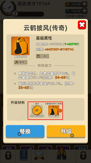 武器尽量打造史诗高阶,数据越大越好。(前期可以攒橙装碎片,兑换屠龙刀金箍棒,优先屠龙刀,吸血效果杠杠的!)