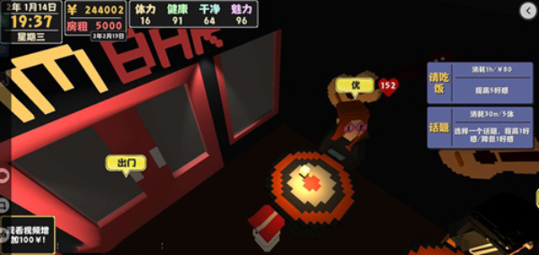 赚钱方法也挺多样化的,打工、开发游戏、直播都能赚,尤其是酒吧打工一次能拿180块,感觉比便利店强多了。不过生活压力也不小,房租缴纳不起就得重新开始,得好好规划开支。