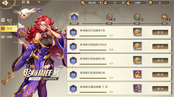 每周任务每周一刷新,完成任务除了可以获得道具奖励外,还可以获得活跃度,活跃度达到一定数量还能解锁更多奖励。