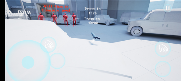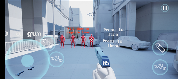 5、枪支在手时,功能键就会变成射击键和投掷键;玩家可以通过十字架来瞄准敌人,然后点击子弹按钮,进行射击;