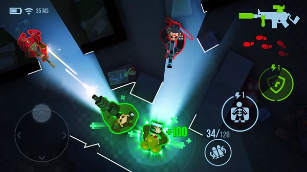 这款游戏没有复杂的剧情设定,纯粹的战术射击体验,与往常所见的大多数fps游戏不同。首先是视角,俯瞰式上帝视角能够让玩家快速了解地形,所处位置;操作上也是极其简单,左手摇杆控制角色移动,右手按键完成换弹、治疗等操作。