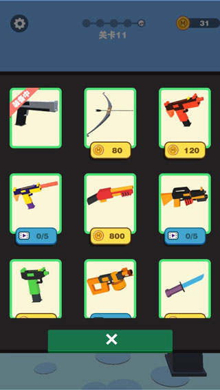 3、游戏是关卡模式,每5个小关组成一个大关卡,完成以后会有金币奖励。目前就发现了一个金币的作用,就是买枪械的皮肤。我觉得里面那个弓箭的皮肤很舒服,因为游戏长按放大的逻辑很符合弓箭的机制,用起来会舒服很多