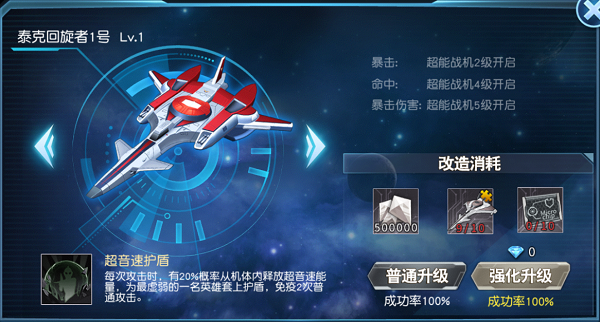 改造泰克雷霆1号时,有几率将战机改造成超能战机泰克回旋者1号,当泰克回旋者1号达到Lv3时,触发超音速护盾技能:泰克回旋者1号每次攻击时,都有20%的几率为最虚弱的奥特曼套上护盾,免疫2次普通攻击!