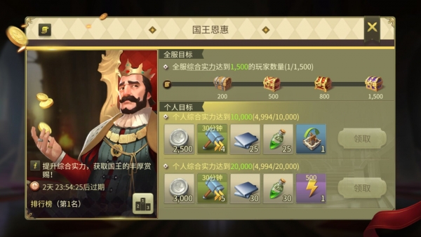 只要提升自己的综合实力,即可参加国王恩惠的活动中去,个人目标达到一定阶段,即可获得奖励,奖励中也包含了大量银克朗!