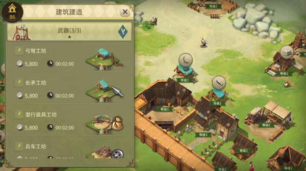 武器建筑包括生产弓箭、长矛、背囊、马具、车具、盔甲、法袍7种武器的工坊,使用这些武器,可以将城市的空闲人口训练成士兵。对内,训练出的士兵可以进行布防,保护我们的城市,对外,士兵们将在领主的领导下英勇出击,夺取胜利!