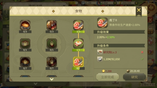 科研技术的要求为需要大类的银克朗,以及对应的科技研究院等级还有时间,科技研究院等级是可以限制能科研的最高等级技术,所以在科研到一定阶段时,如果想获得更高级的加成效果,建议优先升级研究院!