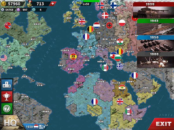 还有一个是HQ按钮右侧的蓝色按键,它的功能主要是保存你的游玩进度,每个年代都各有一个,但一旦重新选择国家就要删档重来了,这里在讲述一下世界征服者4大神的绝招SL大法。