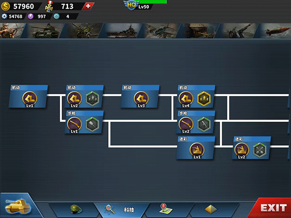 大家可以通过升级科技提高单位战斗力(有时比上将领还厉害),升级科技需要材料而材料就是左上角除显示713勋章以外的所有。主要从剧情 征服 氪金 统治任务中获得。