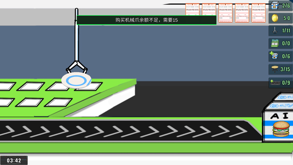 AI老爹汉堡店中文版是由B站up主M木糖M制作的一款经营模拟手游,玩家在游戏中将要经营一座汉堡店,每天都会有各种不同的顾客来到你的汉堡店点餐,你需要根据顾客的需求,在规定的时间内做出汉堡,否则就算失败。同时游戏内有着大量的制作道具,玩家可通过出售汉堡获取金币,然后升级相应设备,如机械爪、传送带、餐桌、汉堡机等,以此加快汉堡的制作速度,完成更多顾客的订单。