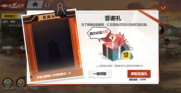 玩家在体验时,解救亡灵可获得亡灵百姓道具,击杀鬼王可额外获得亡灵百姓道具。消耗亡灵百姓道具,可领取亡灵百姓的答谢礼,获得丰厚奖励。同时,助力好友击杀鬼王,可以获得该次击杀鬼王奖励数量的10%。每期活动内助力奖励数量有上限,达到后将不再获得助力奖励。