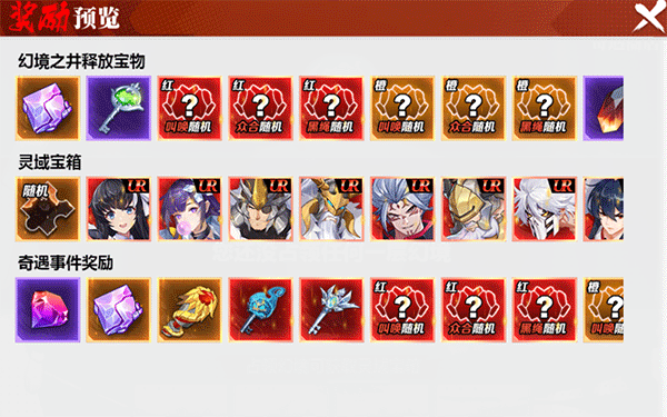 玩家占领新层时都会触发一个保护时间,时长30分钟。占领状态下,幻境之井释放宝物开始计时,每5分钟可获得一份该层的宝物奖励,未满足5分钟则无奖励。同时,每隔一定时间,玩家有概率触发奇遇事件,获得特殊奖励,也能获得一个灵域宝箱,宝箱格位占满后,不再获得宝箱。灵域宝箱分为破旧灵域宝箱、青铜灵域宝箱、黑金灵域宝箱、传奇灵域宝箱幻境,不同品质宝箱打开时间不同,可消耗道具或魂晶提前打开。