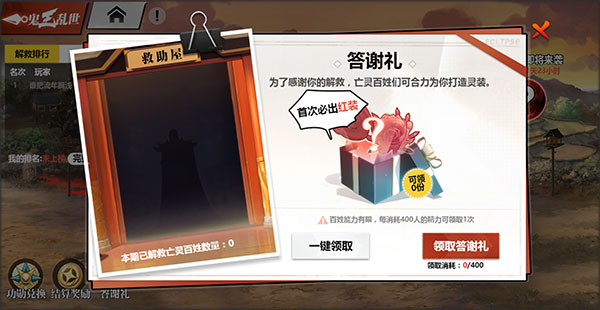 玩家在体验时,解救亡灵可获得亡灵百姓道具,击杀鬼王可额外获得亡灵百姓道具。消耗亡灵百姓道具,可领取亡灵百姓的答谢礼,获得丰厚奖励。同时,助力好友击杀鬼王,可以获得该次击杀鬼王奖励数量的10%。每期活动内助力奖励数量有上限,达到后将不再获得助力奖励。