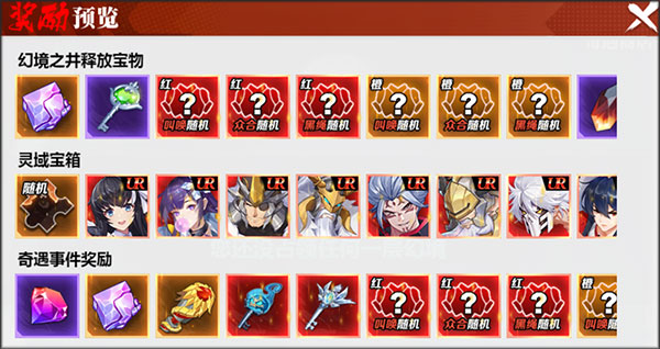 玩家占领新层时都会触发一个保护时间,时长30分钟。占领状态下,幻境之井释放宝物开始计时,每5分钟可获得一份该层的宝物奖励,未满足5分钟则无奖励。同时,每隔一定时间,玩家有概率触发奇遇事件,获得特殊奖励,也能获得一个灵域宝箱,宝箱格位占满后,不再获得宝箱。灵域宝箱分为破旧灵域宝箱、青铜灵域宝箱、黑金灵域宝箱、传奇灵域宝箱幻境,不同品质宝箱打开时间不同,可消耗道具或魂晶提前打开。