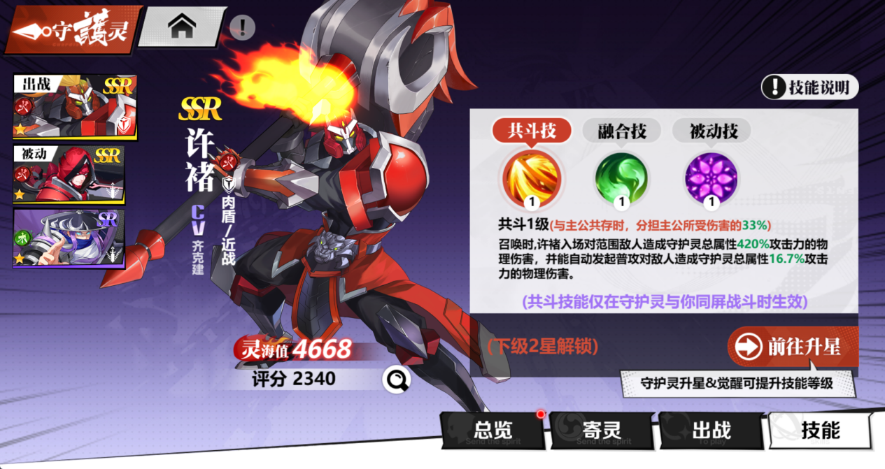 另外,守护灵作为你的“同伴”也能在相应的界面中进行升级。以单个守护灵为例,可以通过升星和觉醒来提升技能等级,需要更多守护灵碎片,所以玩家们需要在唤灵处获得。