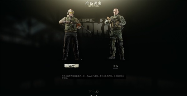 在开始游戏时玩家可以选择Scav和PMC两个阵营开始游戏,其中PMC为玩家自己的角色,而Scav则是相当于扮演游戏中的NPC。
