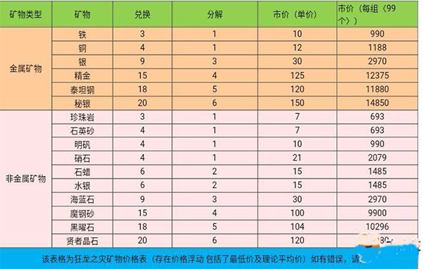 由表中的价格,我们再稍加计算就可以发现,从市场上购买低级矿兑换高级矿似乎并不划算,所以如果想要精铸装备或是进化装备,还是买高级矿比较划算。