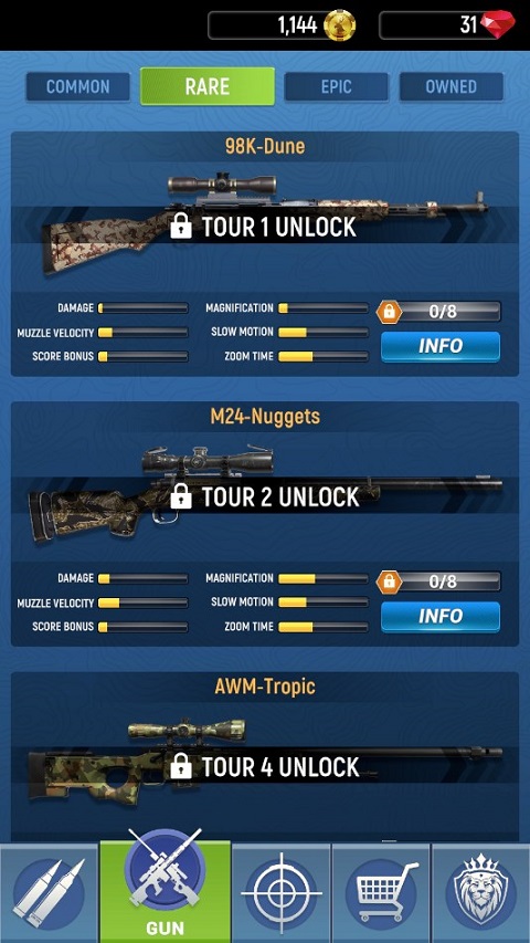 对于快速升级,拥有一把好武器很重要,可以在“武器”图标内挑选,切换更高级的武器后去不同狩猎场打獵,入场券会提高,胜利还能拿经验奖励。最近更新修复了一些小错误,还优化了购买和排名奖励,让玩家体验更好。