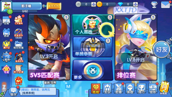 初入游戏,体验个人混战,除了传统的混战以外,还包含单挑争霸、排外赛以及死战、逃生、克隆等共计10多种特色模式,但是每个模式都需要达到一定的等级才能解锁。