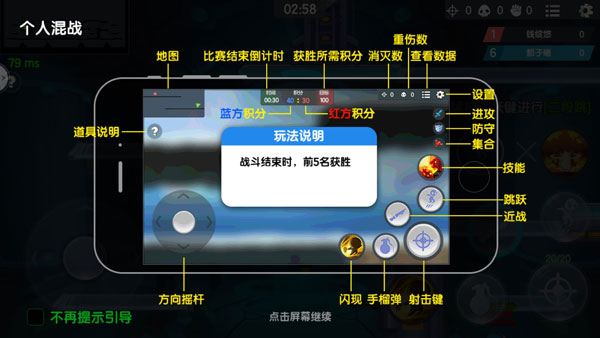 基本操作:左侧方向遥感,右侧闪现、手榴弹、射击等详细操作,而且右侧还分布着英雄的一些攻击、防御属性,发布号令,查看具体说明,轻松完成战场制胜。