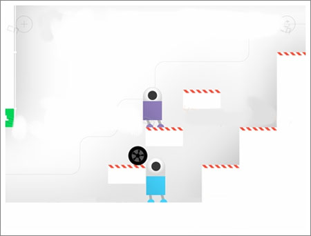 第九十一关两个机器人都利用轮胎往上爬,到最后,先让紫色机器人踩在蓝色机器人头上,然后爬上轮胎,顺利过关。