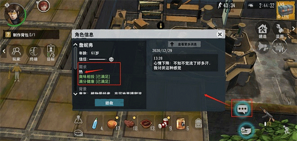 进入到解救人员周围时,可以发起对话进行营救(不同被营救人员在解救中会提出拯救条件,请各位玩家仔细查看拯救内容)。图中第一个圈出的红色方框是与被营救人员对话按钮,第二个红色方框是给予营救人员拯救条件的物品。